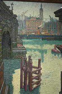 In 1910, Ginner went to London, to serve on the Hanging Committee of the Allied Artists Association's third exhibition. Harold Gilman and Spencer Gore became his friends and persuaded him to settle in London. He lived at first in Battersea, but afterwards in Camden Town, where he was a neighbour of Gilman and Gore and regularly attended the Saturday afternoons at 19 Fitzroy Street, meeting Robert Bevan, John Nash, Albert Rothenstein, C. R. W. Nevinson, Jacob Epstein, Walter Bayes, Walter Sickert, and Lucien Pissarro. In 1911, he became a member of the Camden Town Group; in 1913 of the London Group; in 1914 of the Cumberland Market Group.[2] In 1914 in the New Age he spelt out the artistic creed known as New Realism. In the same year he showed jointly with Gilman at the Goupil Gallery.