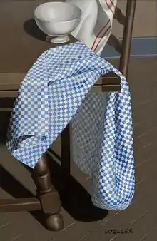 Charles Goeller in his still life gives due weight to a heavy table, textile quality to a white towel with red-lined border, and the acumen of genius to the discriminated planes and color regulations of a checked tablecloth. A truly superb achievement of team work between eyes that see and hands that do.