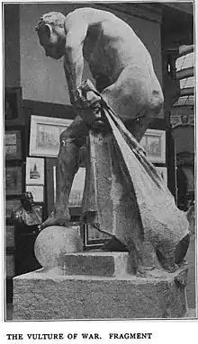 In Paris, he began work on The Vulture of War, a nightmarish sculpture group depicting carnage and death.[5] It quickly evolved from a two-figure work to a three-figure work, and ultimately a four-figure work.[2]:123 These consisted of the colossal figure of War; who wields the uncomprehending Man as a weapon (swings him like a scythe); a lifeless woman (Death and Destruction); and the sinister figure of Plunder, who holds the globe under his foot.[5] Sculptor Jean Dampt provided Grafly with weekly critiques as the work progressed.[2]:119 Of the four figures, only the plunderer was completed by the end of his sabbatical.[5] Grafly returned to teaching at PAFA in Fall 1896,[1] but continued to work on the sculpture group. A heroic-sized plaster of the plunderer was exhibited at PAFA's 1898 annual exhibition,[6]:219 and was part of Grafly's gold medal-winning exhibit at the 1900 Exposition Universelle in Paris.[1] The plaster was also part of Grafly's exhibit at the 1904 Louisiana Purchase Exposition in St. Louis, but he abandoned it there rather than paying the freight fees to ship it back to Philadelphia.[7]:171