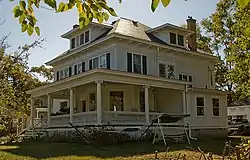Built in 1910 and designed by an unknown person,[1] the Moore House is a weatherboarded building of two and a half stories resting atop a stone foundation. Brick details the structure, which is topped with a hip roof pierced with dormer windows on multiple sides, covered with slates, and supported with a cornice of brackets. A wrap-around porch with Ionic columns forms much of the facade, sheltering the first floor and providing support to the second. Were the porch removed, an overhang would be present on the right side of the house, as seen from the street.[4] Underneath the porch, the first floor includes a prominent bay window to the right of the main entrance, which sits in the center of the facade. The overall shape of the house makes it typical of the American Foursquare style;[2] this style was common in Wyoming's Village neighborhood, which was home to residents of more typical income than the wealthy denizens of the Wyoming Hills.[3]:2