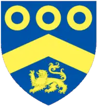Azure a chevron between three annulets in chief and a lion passant in base Or.
