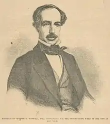 From the time of his return to New York following his Naval service, Haswell also became active in politics. In 1855 he was elected to the New York City Common Council, representing the city's 21st Ward, and in his final year, 1859, he served as president of the council.[10] He served as chairman of a politically stacked grand jury impaneled to investigate voter fraud in the election of 1868. Like most of the members of this body, he was deeply associated with the Tammany Hall political machine,[13] of which he served as leader or Grand Sachem from 1876 to 1882.[14] He would serve as a trustee of the New York and Brooklyn Bridge,[7] and as president of the New York Board of Corrections.[9] A lifelong Democrat, at the time of his death he was the oldest living member of the Tammany organization.[9][15]