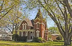The Charles Henry and Charlotte Norton House is a historic building located in Avoca, Iowa, United States. Born in New York and raised in Cass County, Iowa, Norton settled in 1869 at a railroad stop that would become Avoca. He opened a general store that would grow to include hardware and then buggies, wagons, and harnesses.[2] This two-story brick Italianate house with Gothic Revival influences was completed in 1878. Its Italianate features include a two-story stairwell tower, window and door hoods, double front doors, tall arched windows with a round window to the left of the tower, and a single story bay behind the tower. The Gothic Revival style is realized primarily in the ornate vergeboards and the steep pitch of the gables. The house was listed on the National Register of Historic Places in 2004.[1]