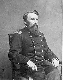 Later on, Whiting participated in George B. McClellan's Peninsula campaign but was captured during the Battle of Gaines' Mill when his horse was shot from under him. After spending some time at the infamous Libby Prison, he was paroled as he was exchanged for another officer and sent back to Washington where he was shortly promoted to major and was then made Major of the 5th Cavalry Regiment on July 17, 1862[3][2] which he then took to participate at the battles of Antietam[5] and Fredericksburg as well as Stoneman's 1863 raid. Despite being one of the few senior majors remaining in the Union Army, Whiting assumed command of the Reserve Brigade when John Buford assumed command of the 1st Division of the Army of the Potomac's Cavalry Corps. The Reserve Brigade consisted of the corp's Regular Army elements; portions of the 1st, 2nd, 5th and 6th U.S. Cavalry regiments, as well as the 6th Pennsylvania Cavalry Regiment. He would serve as brigade commander for just a few weeks.[1][2]