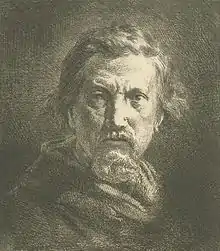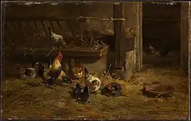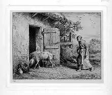 Fleeing the Cholera epidemics that besieged Paris in the mid-nineteenth century, Charles Jacque relocated to Barbizon in 1849 with Millet. There, he painted rustic or pastoral subject matter: shepherds, flocks of sheep, pigs, and scenes of farm life. In addition to painting, Jacque was also famous for his etchings and engravings. He, along with Félix Bracquemond and Felix Buhot, is credited with the nineteenth-century revival of seventeenth-century techniques. He began his career as an engraver around 1841 by publishing a series of etchings with Louis Marvy. He followed this work with a series of engravings based on the works of Adriaen van Ostade, after which he began to create original engravings / artworks. Charles Baudelaire said of him, "Mr. Jacque’s new reputation will continue to grow always, we hope. His etchings are very bold and his subject matter is well conceived. All that Mr. Jacque does on copper is filled with a freedom and a frankness which reminds one of the Old Masters."[1]