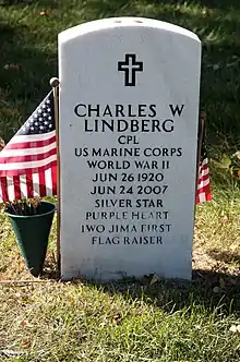 Charles W. Lindberg (June 26, 1920 – June 24, 2007) was a United States Marine Corps corporal who fought in three island campaigns during World War II. During the Battle of Iwo Jima, he was a member of the patrol which captured the top of Mount Suribachi where he helped raise the first U.S. flag on the island on February 23, 1945. Six days later, he was wounded in action.