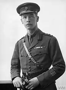 He served on the Western Front during the First World War with the 2nd Battalion, Coldstream Guards, then part of the 4th (Guards) Brigade of the 2nd Division. Promoted to captain in July 1915,[5] he was wounded in action four times, thrice mentioned in despatches, including on 1 January 1918,[6] awarded the Distinguished Service Order (DSO),[7] the Military Cross in 1915[8] and the French Croix de guerre.[9][10][11] He was also, by war's end, a brevet lieutenant colonel and, as Commanding Officer (CO) of the 2nd Battalion, Coldstream Guards, one of the youngest battalion commanders in the British Army.[11] The citation for his MC reads: