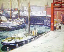 Wharf Scene in Winter (ca. 1910), oil on canvas. In the collection of the City School District of Cincinnati, made available for display to the Cincinnati Museum Center and the Cincinnati Art Museum.
