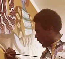Upon his return he created a series of works titled Nigerian Impressions. One notable work painted in 1972 was Filas for Sale which depicted colorful images of masks and patterns that fill the frame of the painting.[5] He received his first commission when he was asked to paint a mural at the William H. Green Federal Building in Philadelphia in 1974.[6] The work Celebration, a study for that mural, is owned by the Smithsonian American Art Museum but is not currently on view.[7] It is a 27 1/2 x 81 3/4 in acrylic on canvas work that depicts masked dancers and colorful figures. Charles Searles was often inspired by music, and his Dancers series in 1975 showcased his ability to portray movement in his work. His piece Dance of the Twin Souls is on display at the Pennsylvania Academy of Fine Arts Museum.[8] He lived in Philadelphia until 1978, when he moved to New York City.[6] In the 1980s he began working on a series of large sculptures including Warrior (1987) and Freedom's Gate (2000) which were between 8 and 10 feet tall.[4] He died in 2004 and is survived by his wife, Kathleen Spicer and his daughter, Vanessa Mitchell.[3] Searles' work was included in the 2015 exhibition We Speak: Black Artists in Philadelphia, 1920s-1970s at the Woodmere Art Museum.[9]