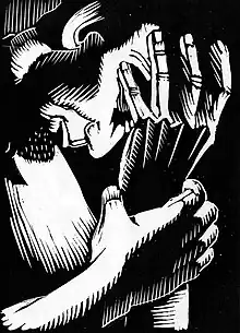 The book was composed entirely of the Turzak woodblock prints, with no additional text, the first-ever such life of a historic figure presented only in images.[4] The book was published on high-quality paper as a slipcased octavo, priced at $3.50.[4] Turzak's images reflected his modernist style and many of the woodblocks portrayed a clearly emotional Lincoln grappling with the personal and public crises he faced, particularly the American Civil War and the effort to end slavery.[4] One Lincoln scholar describes the work as "visually the most modern and race-conscious imagining of the Lincoln saga up to that time" and goes on to say that it "remains the most dramatic visual treatment of the Abraham Lincoln story".[4]