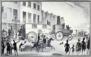 Dance ran Gurney's coaches on the road between Cheltenham and Gloucester until public opposition compelled its withdrawal. The trustees of one of the roads on which the carriage travelled covered part of the road with gravel in an attempt to stop the carriage.[25] In the middle of October 1833 the steam drag and omnibus were put on the road between Wellington Street, Waterloo Bridge and Greenwich, where it continued to run for a fortnight, with a view of showing the public in London what could be done with a steam carriage. It seems there was no intention of making it a permanent mode of conveyance, and therefore kept the company as select as possible by charging half a crown for tickets each way.[26]