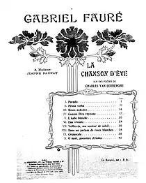 Towards the end of van Lerberghe's lifetime, Gabriel Fauré had discovered in his poetry "a kind of Pre-Raphaelite language of feminine beauty and grace" that inspired in the composer the two song cycles that are the great works of his maturity.[30] Between 1906 - 1909 he set ten poems for La chanson d'Ève, following with another cycle, Le jardin clos, set in 1914. An atheist himself, Fauré used his selection from the former collection to give added emphasis to that work's ambiguous atheism.[31] He chose the title of his second cycle from the second section of Entrevisions, although poems from all its sections were among the eight that Fauré set.