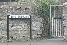 "Tchure" is a common Midlands dialect word for an alley.[11] The Tchure in Charlton-on-Otmoor is an old alleyway that is now a bridleway. Oxfordshire has identically named alleys in Deddington and Upper Heyford.