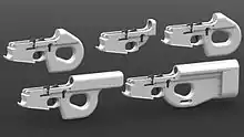 - ↑ Leghorn, Nick, "Coming Soon: 3D Printable AR-15 Lower with P-90 Style Stock", 21 May 2013. (Archive)