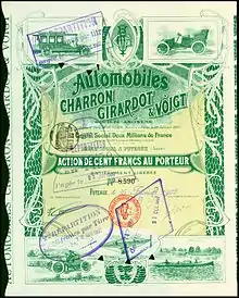 Automobiles Charron, Girardot & Voigt SA (trade mark C.G.V.) was a French motor manufacturer founded by the racing cyclists and motorists Fernand Charron, Léonce Girardot and Émile Voigt.[2]