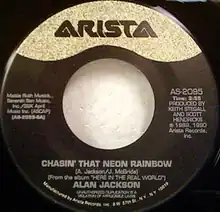 "Chasin' That Neon Rainbow" is a song written by American country music artist Alan Jackson and Jim McBride, and recorded by Jackson. It was released in September 1990 as the fourth single from Jackson's first album, Here in the Real World. The song peaked at number 2 on the Billboard Hot Country Singles & Tracks chart, behind "I've Come to Expect It from You" by George Strait, and number 5 on the Canadian RPM Country Tracks chart.