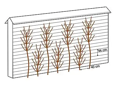 Vines are propagated mainly by simple or basket layering, as well as by cuttings during the March-April period. In the 1850s-1900s, seedlings were also used. Grafting was sometimes used.[26] Vine pruning, essential to the quality of Thomery Chasselas, began in February and was carried out with two eyes (including the heel eye), preserving only the strongest shoots, which were led over the wires running along the walls.[27] Since the beginning of the nineteenth century,[28] trellises at Thomery have been trained using five techniques, all designed to ensure rapid ripening of the wood and the most even possible distribution of sap throughout the plant:[7]