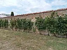 The main distinctive feature of Chasselas cultivation in Thomery, a relatively northerly region for vines, is the use of high espalier walls built from hard stone quarried nearby, held together with earth mortar, and plastered with sand and lime.[8] Initially 2.20 to 2.30 meters high, they were raised around 1850 to an average of 3 meters to maximize production surface area.[8] They are spaced at an average of 9 to 10 meters apart, and are arranged along the slope so as to give the vines the maximum benefit from the sunshine and heat given off by the stone in the evening and at night, and to protect them from the wind. The longest walls could reach 100 meters.[5] At the top of the roof-tile ridge, which protrudes 25 cm, is a small glass canopy which, through a greenhouse effect, increases the amount of sunshine and protects the grapes from the rain.[5][8] The vines are planted only in front of the south-facing walls, spaced 60 to 70 centimeters apart and growing mainly horizontally. Counter-trellises about one meter high are erected one meter from the walls in order to grow other alternative vegetable crops such as apples or pears in the traditional way.[8]