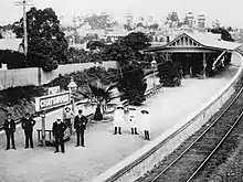 Chatswood station opened on 1 January 1890 when the North Shore line opened from Hornsby to St Leonards.[2] It and the suburb was named after Richard Garnett’s second wife’s pet who was called Chatty. An island platform was built on 23 May 1900 and a third dock platform brought into use on 12 July 1919. There was a small goods yard, similar to the one at St Leonards, on the western side of the station, beyond the northern end of the platforms. The dock platform on the eastern side of the station was used for electric parcel-van traffic and also for terminating some services from the city, until these were rescheduled to terminate further along the North Shore line from January 1992.[3] It was removed in October 1994.[4] Until 1958 there was a tram terminus in Victoria Avenue beside the station. The station entrance was later integrated with a shopping centre called The Interchange in the mid-1980s.
