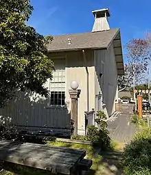 The Chautauqua Hall was built in 1881 by the Pacific Improvement Company for the Pacific Grove Methodist-Episcopal Camp Retreat for seven years (1881-1888). It is located on the southwest corner of 16th Street and Central Avenue. It was called a "Hall in the Grove," and later became known as Chautauqua Hall. The wood-framed structure has a gable roof and board-and-batten siding. The hall served as a location for hosting the annual Chautauqua Recognition Day ceremonies. During the summer months, the large meeting hall provided a place for public lectures, and two classrooms for Sunday school services. During the winter months, the building served as a storage facility for the campground tents.[2]