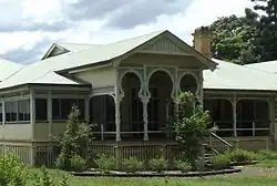 The entrance path divides around a large circular garden bed before leading to the front stairs beside the prominent verandah gable. The front section of the house consists of formal rooms, along the lines of former drawing and dining rooms, a sitting room and lounge. A bay-fronted room is positioned behind the front gable and is of the same width, projecting a metre or so across the front verandah. The front verandah turns around this room forming the southern edge of the house. Immediately to the northern side of this front formal room is the entrance hall, and to the north of this again are two rooms back to back around a double-sided fireplace. The position of this fireplace is conveyed by the chimney in the views of the building from the front. The verandah turns around this pair of rooms, forming what was the northern side of the original house. The verandah edge details are still intact along this northern side verandah, indicating that c. 1941 northern addition to the original house was built immediately adjacent to the original house rather than cut into it.[1]