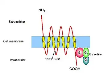 Typical structure of a chemokine receptor, with seven transmembrane domains and a characteristic "DRY" motif in the second intracellular domain. Chemokine receptors are usually linked to a G-protein through which they signal.