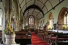 The church of St Mary has a 13th-century chancel but the remainder of the building is of the Perpendicular period. The west tower and north aisle are built of ashlar-granite. Features of interest include the old wagon roofs of the chancel, the Norman font, the old screen to the north chancel chapel and the 16th century pulpit.[3]