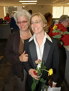 Chase has written about being openly lesbian since her 20s.[20] Chase married her partner of five years, Robin Mathias, in San Francisco in 2004. They live on a hobby farm in Sonoma and remarried in 2008 following the In re Marriage Cases.[21]