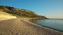 Chesil Cove is a curved steep bank forming the south-east end of 29-kilometre (18 mi) Chesil Beach in Dorset, England. It is thus part of one of three large shingle structures in Britain, extending from West Bay to the Isle of Portland (Portland Bill), the latter acting more firmly as a great barrier (groyne) which stops tidal action from washing the beach away and leads to the high depositions by wind and tide action forming the grand curved bank of this "cove". The "cove", bill and much of Chesil Beach give shelter from the prevailing winds and waves for much of Weymouth Bay, the town of Weymouth and the village of Chiswell. It forms part of the Jurassic Coast.[1]