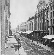 The second Chestnut Street Theatre was demolished in 1855.[8] The neighborhood around Chestnut and Sixth had become increasingly unfashionable and the narrow streets were often congested by business traffic. In addition, The Chestnut Street Theatre, which had been a home to opera performances in Philadelphia for many years, was now regarded as too small and cramped for the Grand Opera performances of the era. In 1854, a committee of prominent Philadelphians funded and ordered construction of the much larger and grander American Academy of Music on Broad Street, which was completed and opened in early 1857. Some of the traditions of "Old Drury" were imported to the academy, including the bell that announced the rising of the opening curtain.[9]