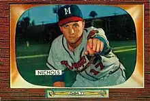 Nichols Jr. was born in Pawtucket, Rhode Island, where he attended East High School. After spending the 1949 and 1950 seasons in the Braves' farm system, he made Boston's 1951 roster out of spring training. He pitched exclusively in relief through May 23, posting a 3.00 ERA. In his first starting assignment, June 3 at Braves Field against the Cincinnati Reds, he held a 2–1 lead into the eighth inning when Cincinnati rallied for three runs;[1] Nichols was saddled with the 4–2 defeat, but he threw a complete game and earned a place in Boston's starting rotation. Six days later, Nichols threw another complete game, this time a six-hit, 6–1 triumph over the St. Louis Cardinals.[2] Nichols went on to work in 33 games, 19 as a starter, and compiled an 11–8 won–lost record. His 2.88 earned run average in 156 innings pitched was five-one-hundredths of a point better than Sal Maglie's 2.93, giving Nichols the National League's ERA title. He threw 12 total complete games, posted three shutouts, and earned two saves out of the bullpen.