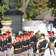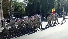 2011 celebrated the 20th anniversary of independence.[7] Acting President Marian Lupu, who signed the order for the parade that April[8] delivered the holiday address during the parade. Inspecting the parade from a GAZ-24 cabriolet parade car was the Minister of Defense of Moldova Vitalie Marinuța while the officer commanding the parade was Brigadier General Vitalie Stoian from the National Army's General Staff.[9] Dress rehearsals took place three, seven and ten days before the parade, with the first rehearsal on August being attended by Prime Minister of Moldova Vlad Filat.[10][11][9][12][13] It was the first time military equipment had been brought to the central square sine 1989.[14] At the head of the parade were the flag of Moldova, as well as the military banners of the Emperor Stefan the Great, which were brought to Chisinau from Romania as a gesture on their part.[15] The contingent of veterans of the Transnistrian War was led by Division General Ion Costaș, a former Minister of Interior (1990–1992) and Defence (1992).[16] A new, more western style marching formula was used for the parade[17][9] as well as new military uniforms were used during the parade.[18]