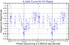 Chi Pegasi is a suspected small-amplitude variable.[5] Koen and Eyer examined the Hipparcos data for Chi Pegasi, and found that its brightness varied by 0.0094 magnitudes, with a period of 5.9641 days.[13]