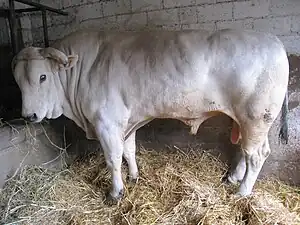 The Chianina is one of the oldest breeds of cattle. It originates in the area of the Valdichiana, from which it takes its name, and the middle Tiber valley.[4] Chianina cattle have been raised in the Italian regions of Tuscany, Umbria and Lazio for at least 2200 years.[5] Columella, writing about types of oxen in about 55 AD, says "Umbria vastos et albos ..." (VI.I.2),[6] which in the first English translation is "Umbria has such as are huge, and of a white colour".[7]: 258 Chianina oxen were the principal source of agricultural power in the area until displaced by mechanisation and the collapse of the mezzadria system following the Second World War; they were in use in agriculture until at least 1970[8] and are still used in processions such as the corteo storico of the Palio di Siena. From 1931 breeders began to favour selection of animals more suited to meat production, with shorter limbs, longer bodies and more heavily muscled rump and thighs; recently, selection is based also on factors such as growth rate, meat yield and, in cows, maternal ability.[5] While one source reports a herdbook dating from 1856,[9] others date the institution of the Libro Genealogico ("genealogical herdbook") to 1933, when a breed standard was established and commissions were set up by the then Ministero dell'Agricoltura e delle Foreste (ministry of agriculture and forestry) to identify, mark and register morphologically suitable animals; the standard of the Chianina breed was fixed by ministerial decree of 7 August 1935.[10] A private register was previously kept by the largest cattle breeder of the Sienese Valdichiana, the Eredi del conte Bastogi of Abbadia di Montepulciano,[10] and a group of breeders had in 1899 formed a society, the Società degli Agricoltori della Valdichiana (society of farmers of the Valdichiana), of which a principal aim was the establishment of a herdbook.[11][12]