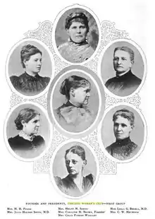The Chicago Woman's Club was formed in 1876 by women in Chicago who were interested in "self and social improvement."[1] The club was notable for creating educational opportunities in the Chicago region and helped create the first juvenile court in the United States.[1] The group was primarily made up of wealthy and middle-class white women, with physicians, lawyers and university professors playing "prominent roles."[2] The club often worked towards social and educational reform in Chicago. It also hosted talks by prominent women, including artists and suffragists.[3][4][5][6][7][8][9][10]