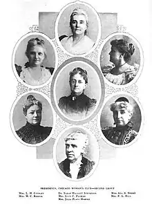 Many notable women were members of the club. Physician, Sara Hackett Stevenson was president from 1892 to 1894.[117] Ada Celeste Sweet was elected president in 1894.[111] Novelist and preacher, Celia Parker Woolley,[118] reformer Lucy Flower,[119] Lydia Avery Coonley,[120] and Julia Holmes Smith,[121] also served as presidents. Many of the presidents of the Chicago Woman's Club had also been members of the Fortnightly Club.[122]