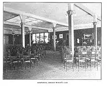 The members of the club initially met at Brown's house.[15] In 1877, they rented rooms in the Chicago Literary Club on Monroe Street.[21] Later, they started to meet at the Palmer House,[22] and Grand Pacific.[23] In 1894, the club had moved into the Potter Building, and to mark the occasion, they held a reception, where for the first time men were also invited to attend.[14] Later, in 1916, the club would vote against allowing an "Associate Membership" for men.[24] The club had a new location on Michigan Avenue in 1929, and also during that year again considered creating an "Associate Membership" for men.[25] The building on Michigan Ave. was six stories high and designed by Holabird & Roche along with engineer Frank E. Brown. This building is now part of Columbia College.[26] The group increased from 30 to 60 members in 1881.[23] By 1894, there were 600 members.[14] In 1896, the club had increased to 730 members.[27] In 1901, there were 900 members,[28] increasing to 1,000 by 1906,[29] and to 1,200 members in 1921.[30] Annually, the Chicago Woman's Club produced a large yearbook which described the activities of the club over the past year.[31] The club's motto was "Humani nihil a me alienum puto."[32] On May 25, 1892, they adopted the official colors for the club of ivory white and gold.[33]