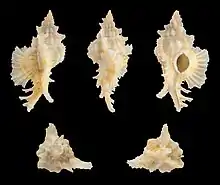 | Five views of a shell of Chicoreus orchidiflorus, 27 mm in length | |