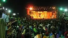 The festivals in Chidambaram are centred on the festivals of the temple. The Marghazhi Thiruvaadhirai festival celebrated in December–January indicates the first puja, the fourteenth day after the new moon (Chaturdashi) of the month of Masi (February–March) indicates the second pooja, the Chittirai Thiruvonam (in April–May), indicates the third pooja or uchikalam, the Uthiram of Aani (June–July) also called the Aani Thirumanjanam indicates the evening or the fourth puja, the chaturdasi of Aavani (August–September) indicates the fifth puja and the chaturdasi of the month of Puratasi (October–November) indicates the sixth pooja or Arthajama. Of these, the Marghazhi Thiruvaadhirai (in December–January) and the Aani Thirumanjanam (in June–July) are the most important festivals. During these festivals, the festive deity is brought outside the sanctum sanctorum in a procession that includes a temple car procession followed by a long anointing ceremony.[31] Several hundreds of thousands of people flock the temple to see the anointing ceremony and the ritualistic dance of Shiva when he is taken back to the sanctum sanctorum. Shiva, in his incarnation of Nataraja, is believed to have born on full moon day in the constellation of Ardra, the sixth lunar mansion. Lord Shiva is bathed only 6 times a year, and on the previous night of Ardra, the bath rituals are performed on a grand scale. Pots full of milk, pomegranate juices, coconut water, ghee, oil, sandal paste, curds, holy ashes, and other liquids and solids, considered as a sacred offering to the deity are used for the sacred ablution.[10]
