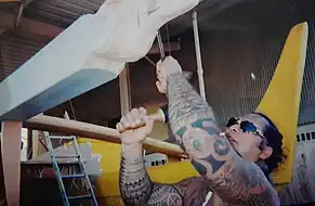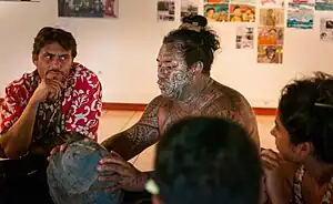 In 2014 Miko joined the CCCTP collective, Center de Création Contemporaine Teroronui de Papeete,[13] a transdisciplinary collective chaired by Jonathan Bougard, whose objective was to work towards the perpetuation of local cultures while supporting the relationship with the means of modern communications.[14] Within this collective Miko finds artists such as Max Tohitika, Julien Magre, Massimo Colombini, Moana Heitaa and the sculptors Pitore and Teva Victor . They exhibited at the Maison de la Culture de Tahiti,[15] Te Fare Tauhiti Nui, then at the University of French Polynesia.[16] According to a text by Jean-Louis Poitevin, “The CCTP intended “ giving the desire for image a central place in the cultural and social life of Tahiti. (...) From tradition to the diffusion of this tradition, from tattooing with a comb to new technologies, this exhibition questions and provides its answers, defines what it means to be an artist today in Tahiti and gives pride of place to artists as well. Polynesians than with offbeat looks.[17]" Beyond the exhibition of paintings, sculptures, Indian inks, happenings and live creations are organized : Chief Miko sculpts live with a chainsaw, then traditional tattoo sessions with a comb, a seminar around these aspects follow.[18]