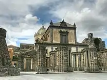 The façade is framed with dark lava stone pilasters. In the tympanum above the portal is a marble depiction of the Assumption of the Virgin. The side portals have lava stone jambs surmounted by a triangular tympanum in Baroque style. In front of the church are lava stone pillars that were meant to support at tall bell-tower, commissioned in the late 19th-century by the provost Salvatore Petronio Russo, and designed by Carlo Sada. This expensive project became mired due to costs and disputes, and after decades of fitful construction only a skeletal bell-tower was present by 1957. In 1997, church and civil authorities agreed to demolish the tower. The base pilasters remain.