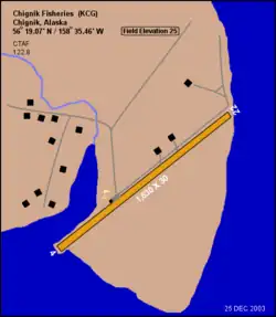 Chignik Fisheries Airport (IATA: KCG[2], FAA LID: KCG) was a public-use airport located 6 nautical miles (11 km) northwest of Chignik,[1] a city in the Lake and Peninsula Borough of the U.S. state of Alaska.