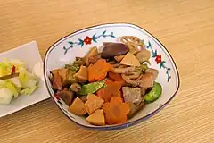 Chikuzenni (筑前煮, chikuzen-ni) is a dish that originated from northern Kyushu, Japan, made of braised chicken and vegetables. It is often eaten when bringing in the new year in Japan.