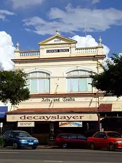 In 1911, an upper floor was added.[4] This addition included the adjoining shop, so that a new and larger decorative pediment was created. A photograph dating from around 1913 shows that other tenants, including a bootmaker and the New Zealand Insurance Company, also used Gaydon's building. The upper floor was lit by a lantern and a pair of large compound windows and so had excellent light for its use a dental surgery by Thomas Gaydon, who in addition to his work as a pharmacist, also practised as a dentist, photographer and anaesthetist to the local hospital. He was a public-spirited man and also served as president of the Chamber of Commerce, School of Arts, hospital and School committees at various times. He was the second chairman of the Isis Shire Council in 1919 and served in this role again between 1924 and 1930.[1]