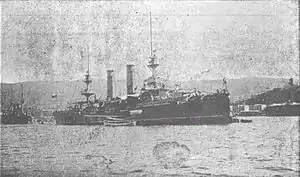 As a protected cruiser, the ship's vitals were protected by a full-length arched deck of steel armour, 3+1⁄2 inches (89 mm) thick on the slopes and 1+1⁄4 inches (32 mm) on the horizontal part of the deck. The ship's conning tower was protected by 4 inches (100 mm) of armour.[4][1] The ship's main gun armament consisted of eight 6-in (152 mm) 45-calibre quick-firing guns, with two fore-and-aft on the ship's centreline, and three on each beam. The secondary armament was ten 6-pounder (57mm) guns and four 3-pounder (47mm) guns. The ship was fitted with three 18-inch (450mm) torpedo tubes, one fixed in the bow and the other two on swivelling mounts on the ship's broadside.[1]