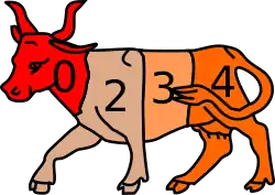 In 1860 the medialuna was put in place, similar to the one that is run today, with a ring and two thatches, which is the place where the riders need to stop the cattle.[33] In those days, thirty or more head of cattle were locked up in the ring so that each couple would remove the cattle from their brand with no help other than their skill, a difference from today, when the cattle are in a bullpen and leave the court randomly.[29] The medialuna has a radius of 20 to 25 metres.[34] Previously rodeos were played on a rectangular court that made it difficult to drive the cattle.