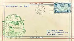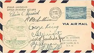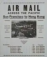 On November 22, 1935, it took off from Alameda, California on commission to deliver the first airmail cargo across the Pacific Ocean.[3] Although its inaugural flight plan called for the China Clipper to fly over the San Francisco–Oakland Bay Bridge (still under construction at the time), upon take-off the pilot realized the plane would not clear the structure, and was forced to fly narrowly under instead. On November 29, the airplane reached its destination, Manila, after traveling via Honolulu, Midway Island, Wake Island, and Sumay, Guam, and delivered over 110,000 pieces of mail. The crew for this flight included Edwin C. Musick as pilot and Fred Noonan as navigator.[4] The inauguration of ocean airmail service and commercial air flight across the Pacific was a significant event for both California and the world. Its departure point is California Historical Landmark #968 and can be found in Naval Air Station Alameda.[5]