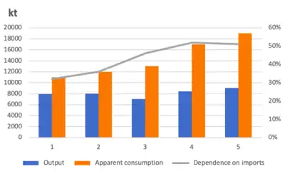 Demand for PX has been increasing due to the rapid development of China's polyester and PTA sectors. However, domestic output has remained rather stagnant. In 2005, China's demand exceeded internal supply by 1.55 million tons and the deficit was met mainly by imports.[6] The country's apparent consumption of PX was 16.572 million tons in 2013, which showed an increase of 19.9% over the previous year. Output was 7.7 million tons, the same as in 2012.[8] From 2010 to 2014, apparent consumption increased by nearly 8 million tons, whilst output only increased by slightly more than 1 million tons.[11]