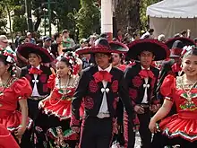 • A skirt called castor (or, "beaver"), named after the material it was made from. According to some historians, castor was used by well-heeled ladies of the household to make the underskirts of their indigenous maids.[3] The castor skirt was decorated with sequins and camarones (literally, shrimp) that formed geometric and floral shapes.[4] Folkloric dance groups have revived a version that has the coat of arms of Mexico embroidered with sequins, beads, and bugles (a type of bead).