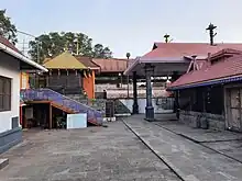 There are two shrines, Thazhekavu (lower shrine) and Melakavu (upper shrine). Melakavu is believed to be older than Thazekavu. The priests of the upper shrine traditionally come from the Kulangara Nair family of Palappuram. Namboothiri priests do the poojas in the lower shrine and in the ten days of pooram. They are in charge of the upper shrine as well. There is a shrine dedicated to Lord Ganapathy who is believed to be in his divine "Vidya Ganapati" form, adjoining the temple complex near the iconic banyan tree.